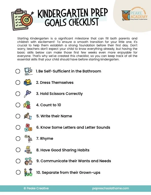 Here’s a FREE Kindergarten Prep Goal Checklist made by Peake Academy Preschool At Home to help you keep track of all the essential skills that your child should have before starting kindergarten.